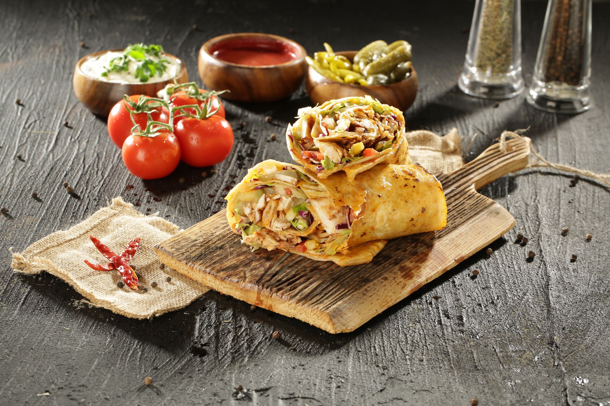 miękka tortilla, mięso, ser, surówki, pomidor, ogórek, cebula, sos, pasta czosnkowa -