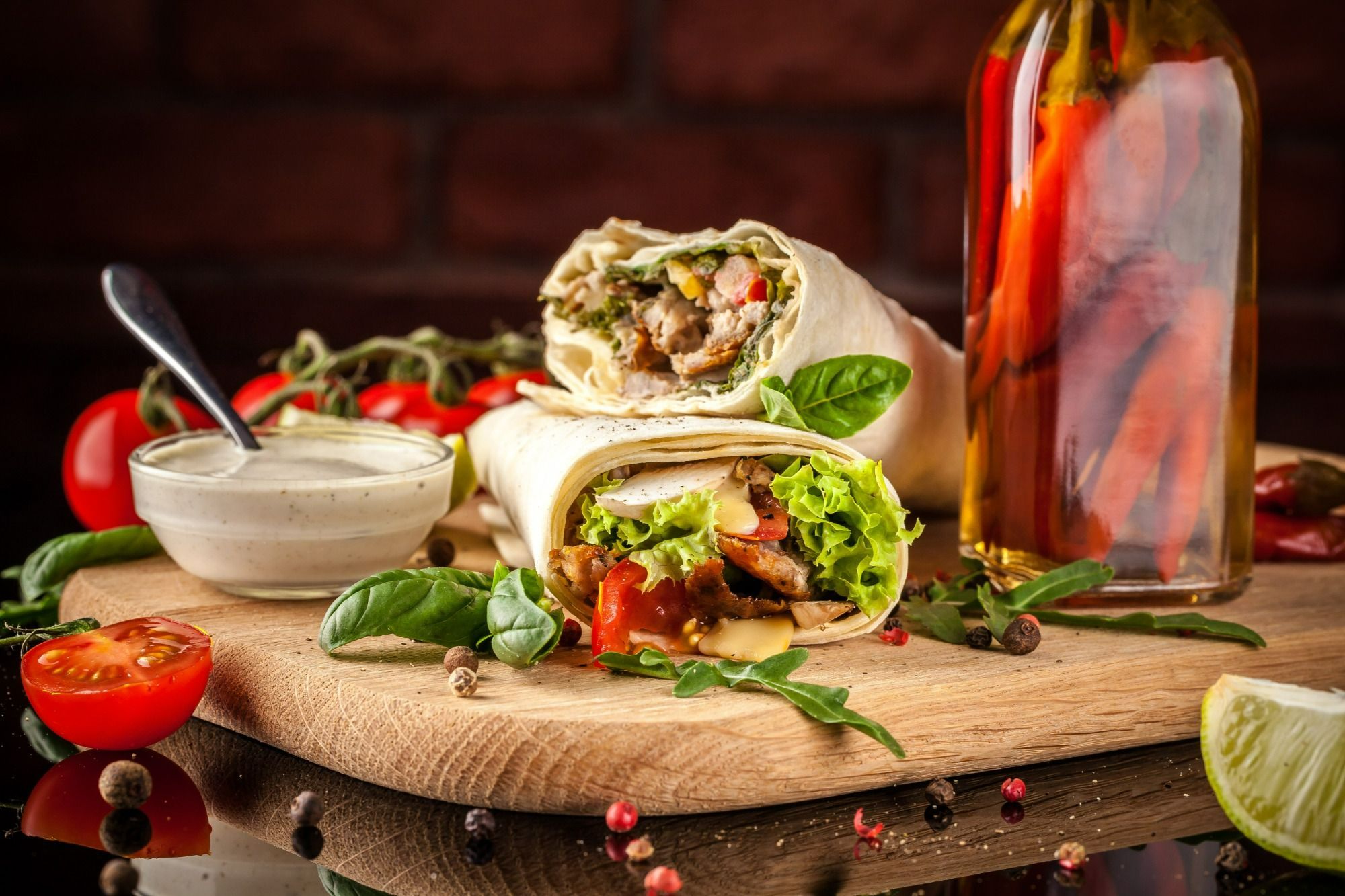 miękka tortilla, mięso, sos, pasta czosnkowa -